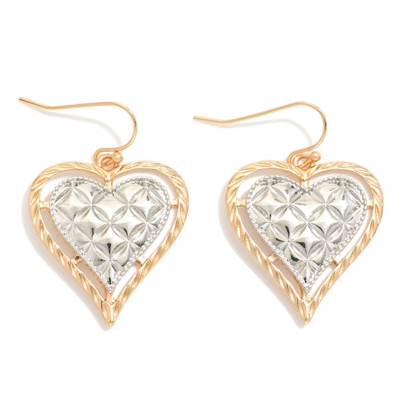 Metal Tone Quilted Heart Drop Earrings With Twisted Metal Border