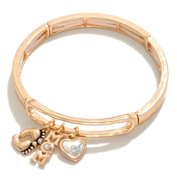 Metal Stretch Bangle Bracelet Featuring 'MOM', Heart And Baby Feet Charms