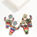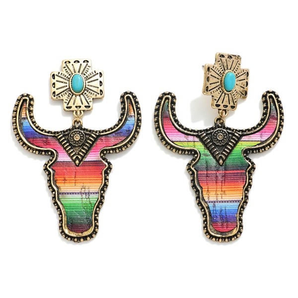 Metal Tone Western Bull Head Drop Earrings Featuring Turquoise Accents