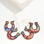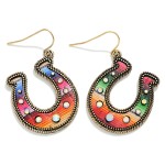 Metal Tone Western Horseshoe Drop Earrings Featuring Turquoise & Rhinestone Accents