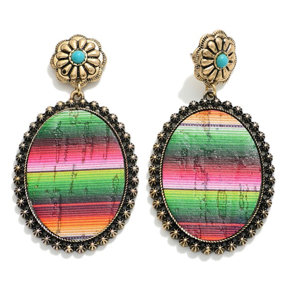 Metal Tone Western Oval Drop Earrings Featuring Turquoise Accents