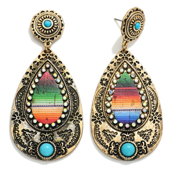 Metal Tone Western Teardrop Drop Earrings Featuring Turquoise & Rhinestone Accents