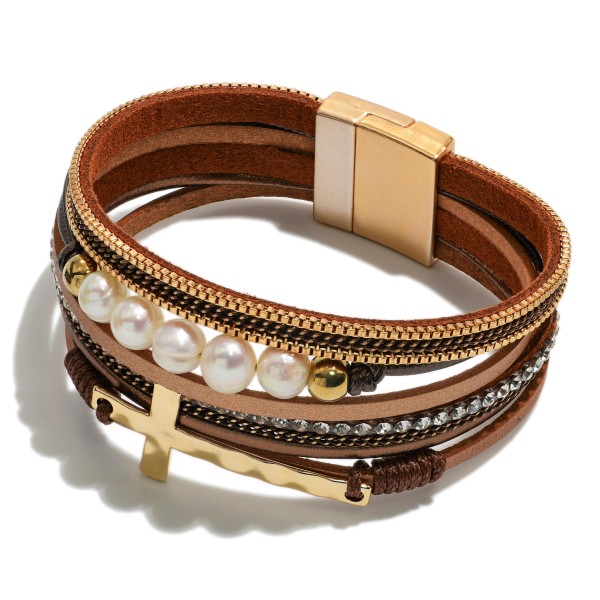 Multi Strand Magnetic Bracelet Featuring Cross And Freshwater Pearls