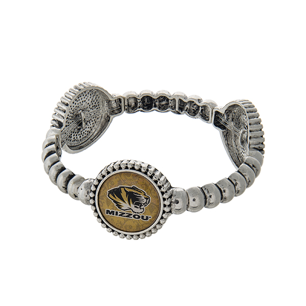 Officially licensed silver tone University of Missouri stretch bracelet with three stations. Our exclusive design.