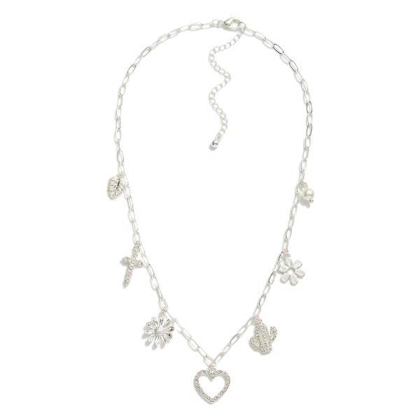 Paperclip Chain Link Charm Necklace Featuring Rhinestone & Pearl Studded Charms