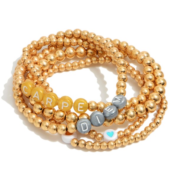 5 PC Beaded Block Letter Stretch Bracelet Set in Gold Featuring Heart Accents.