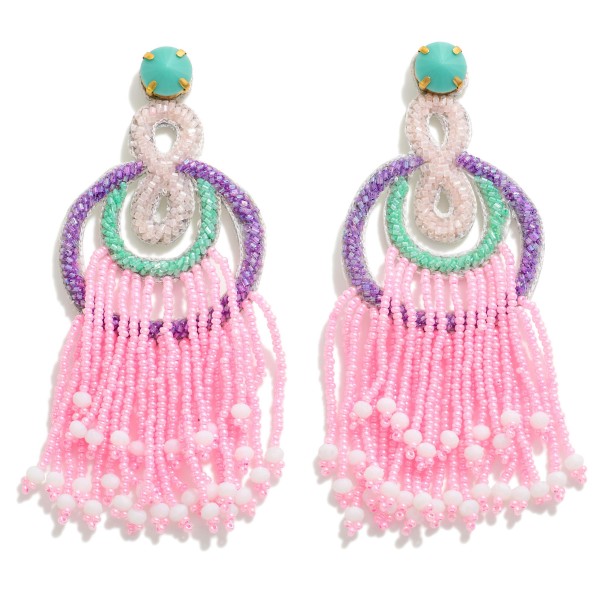 Pink and Purple Statement Seed Beaded Tassel Drop Earrings With Teal Accents