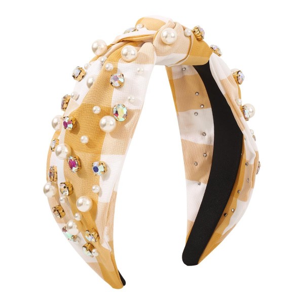 Rhinestone And Pearl Studded Plaid Headband With Top Knot Detail