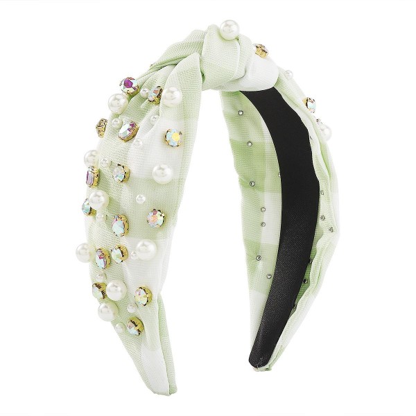 Rhinestone And Pearl Studded Plaid Headband With Top Knot Detail
