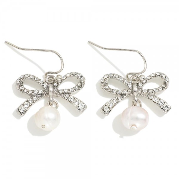 Rhinestone Studded Bow Post Drop Earrings Featuring Pearl Detail