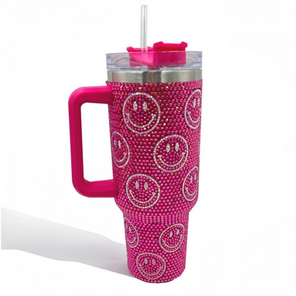 Rhinestone Studded Happy Face 40oz Double Wall Stainless Steel Vacuum Tumbler With Handle