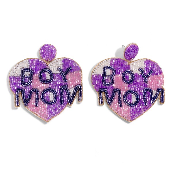 Seed Beaded Plaid Heart 'Boy Mom' Drop Earrings