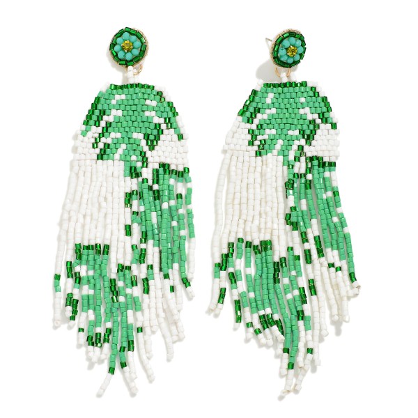 Seed Beaded Tropical Monstera Leaf Tassel Drop Earrings