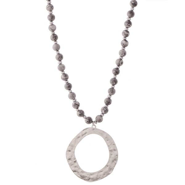 Semi-Precious Stone Beaded Necklace Featuring Hammered Metal Flatted Circle Pendant