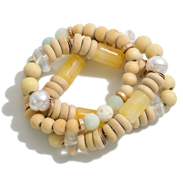 Set of 3 Beaded Stretch Bracelets Featuring Wood, Stone, and Porcelain Beads