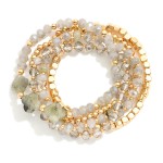 Set Of Five Beaded Stretch Bracelets Featuring Faceted Beads, Metal Tones, & Stone Clovers