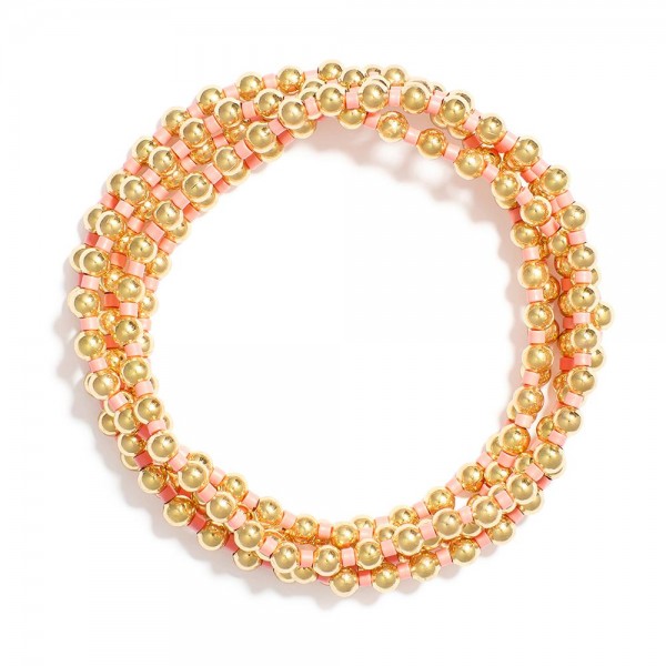 Set Of Five Beaded Stretch Bracelets Featuring Metal Tones & Disk Beads