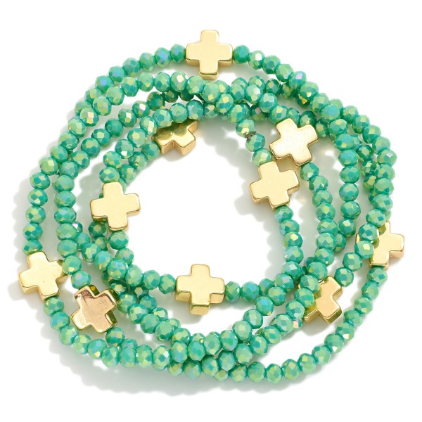 Set of Five Faceted Glass Bead Stretch Bracelets Featuring Dainty Metal Gold Tone Cross Beads