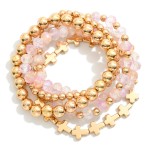 Set of Five Faceted Glass and Metal Tone Beaded Stretch Bracelets Featuring Metal Cross Bead Focal