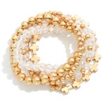Set of Five Faceted Glass and Metal Tone Beaded Stretch Bracelets Featuring Metal Cross Bead Focal