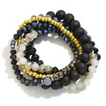 Set of Five Faceted Glass and Wood Beaded Stretch Bracelets