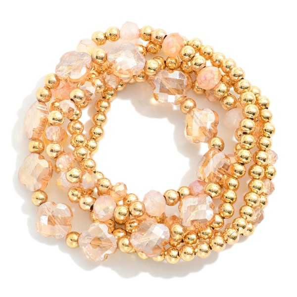 Set of Five Metal and Faceted Glass Beaded Stretch Bracelets Featuring Glass Crystal Clover Beads