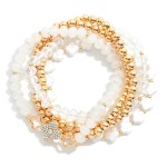Set of Five Metal Tone and Faceted Glass Beaded Stretch Bracelets Featuring Pearl Clover Beads and Rhinestone Studded Clover Charm