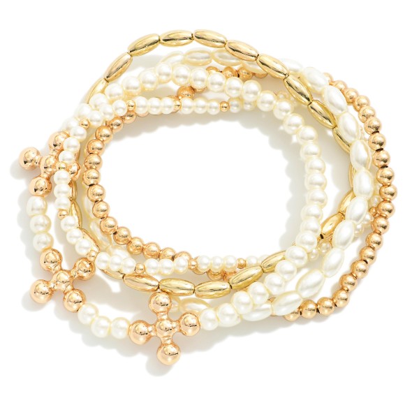 Set of Five Pearl and Metal Tone Beaded Stretch Bracelets Featuring Dainty Beaded Cross Charms