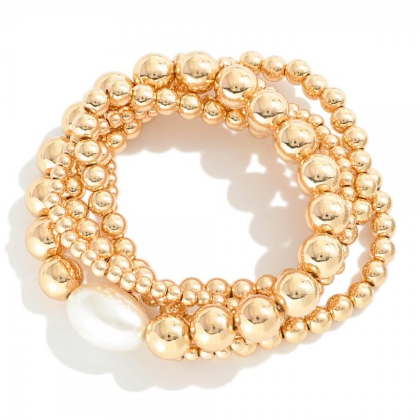 Set of Five Polished Metal Beaded Bracelet With Pearl Station