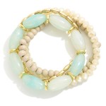 Set of Four Beaded Stretch Bracelets Featuring Elongated Polished Natural Stone Beads and Wood Beads