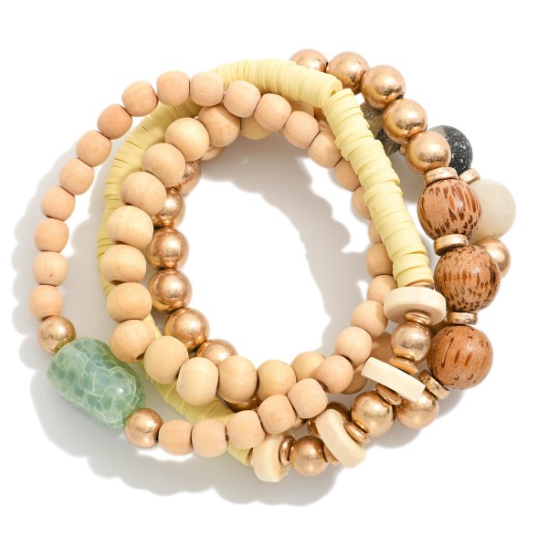 Set of Four Beaded Stretch Bracelets Featuring Wood, Natural Stone, and Heishi Beads