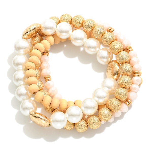 Set of Four Mixed Media Stretch Bracelets Featuring Pearl, Wood, and Textured Metal Tone Beads