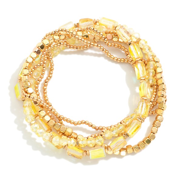 Set Of Six Beaded Stretch Bracelets Featuring Gold Tones, Faceted Beads, & Glass Crystal Beads