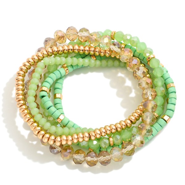 Set of Six Mixed Media Stretch Bracelets Featuring Wood, Faceted, and Metal tone Beads