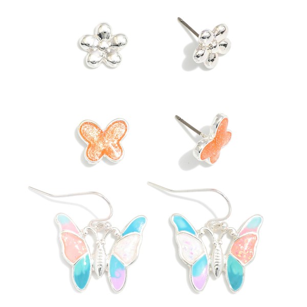 Set of Three Beach Stud Earrings Featuring Flower & Butterflies