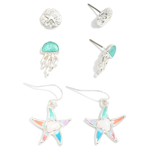 Set of Three Beach Stud Earrings Featuring Jellyfish & Starfish