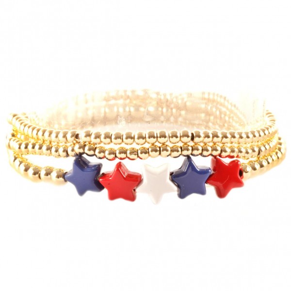 Set of Three Beaded Metal Bracelets Featuring Red, White, and Blue Star Accents.