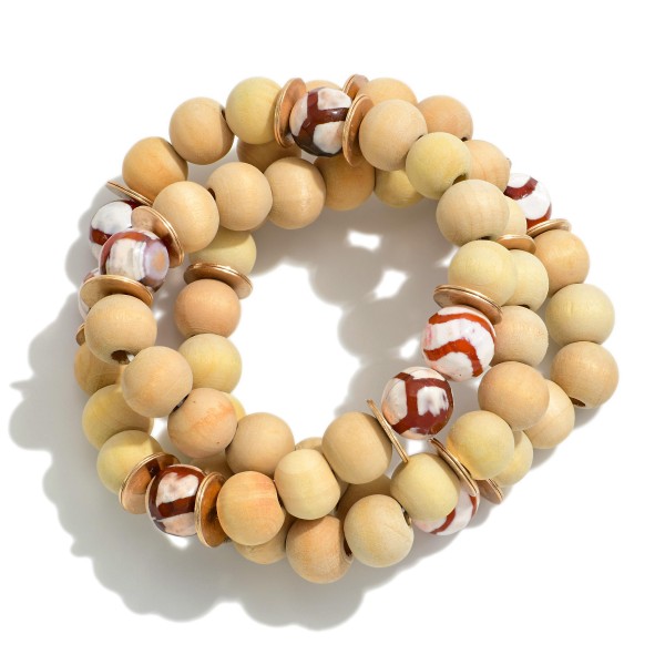 Set of Three Beaded Stretch Bracelet Featuring Wood, Disc, and Painted Honeycomb Beads