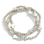 Set Of Three Beaded Stretch Bracelets Featuring Metal Tones & Cross Stations