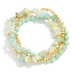 Set Of Three Beaded Stretch Bracelets Featuring Metal Tones, Faceted Beads, & Stones