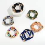 Set of Three Beaded Stretch Bracelets Featuring Wood, Acetate, and Wavy Gold Tone Disk Beads