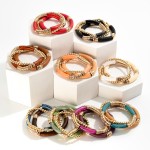 Set of Three Beaded Stretch Bracelets Featuring Wood, Acrylic Tube, and Gold Tone Disk Beads.