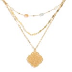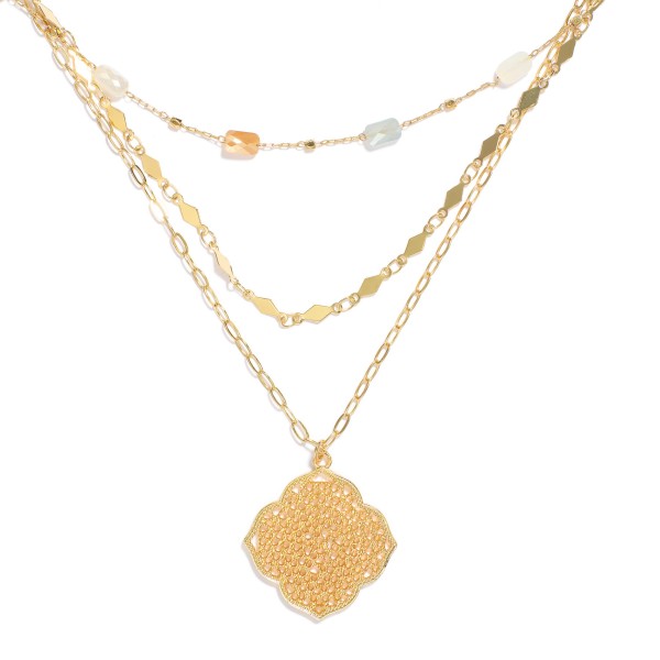 Set Of Three Chain Link Necklace Featuring Metal Tones, Faceted Beads, Quatrefoil Pendant