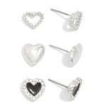 Set Of Three Heart Stud Earrings Featuring Metal Tones & Rhinestones