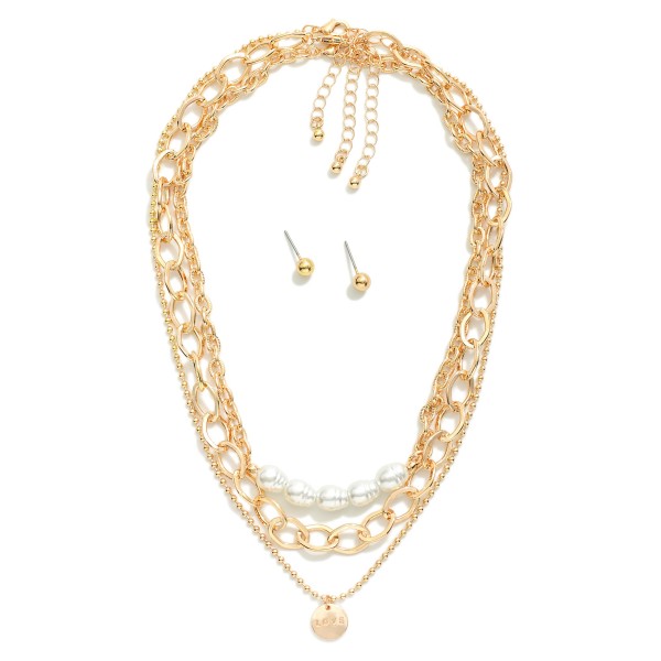 Set Of Three Metal Chain Link Necklace Featuring Pearls And Metal Stud Earrings