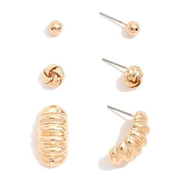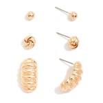 Set Of Three Metal Tone Earrings Featuring Knotted & Ridged Details