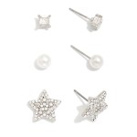 Set Of Three Metal Tone Earrings Featuring Rhinestone, And Pearls
