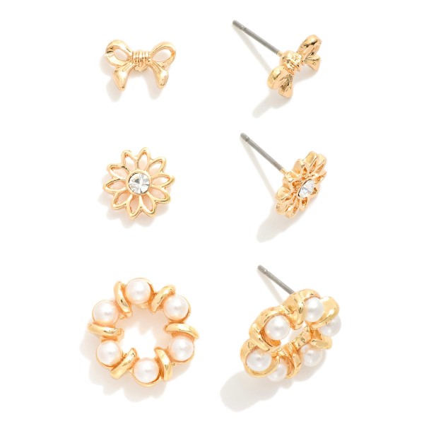 Set Of Three Stud Earrings Featuring Metal Tones, Pearls & Rhinestones