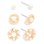 Set Of Three Stud Earrings Featuring Pearls & Metal Tones
