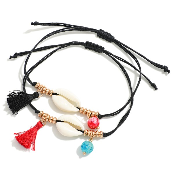 Set of Two Adjustable Friendship Bracelets Featuring Cowrie Shells, Tassels, and Painted Glass Bead Charms